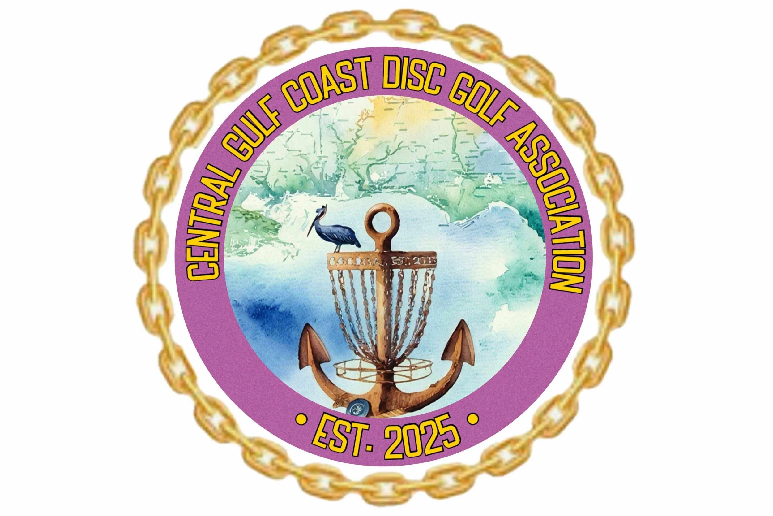 Our logo tells our story: an anchor transformed into a disc catcher symbolizes our commitment to grounding disc golf in this region; the pelican represents long flight and resilience; the map and Mardi Gras colors celebrate the identity and culture of the Gulf Coast.